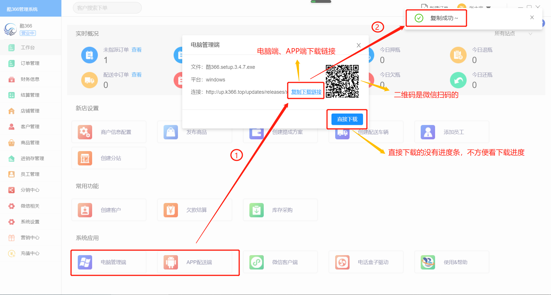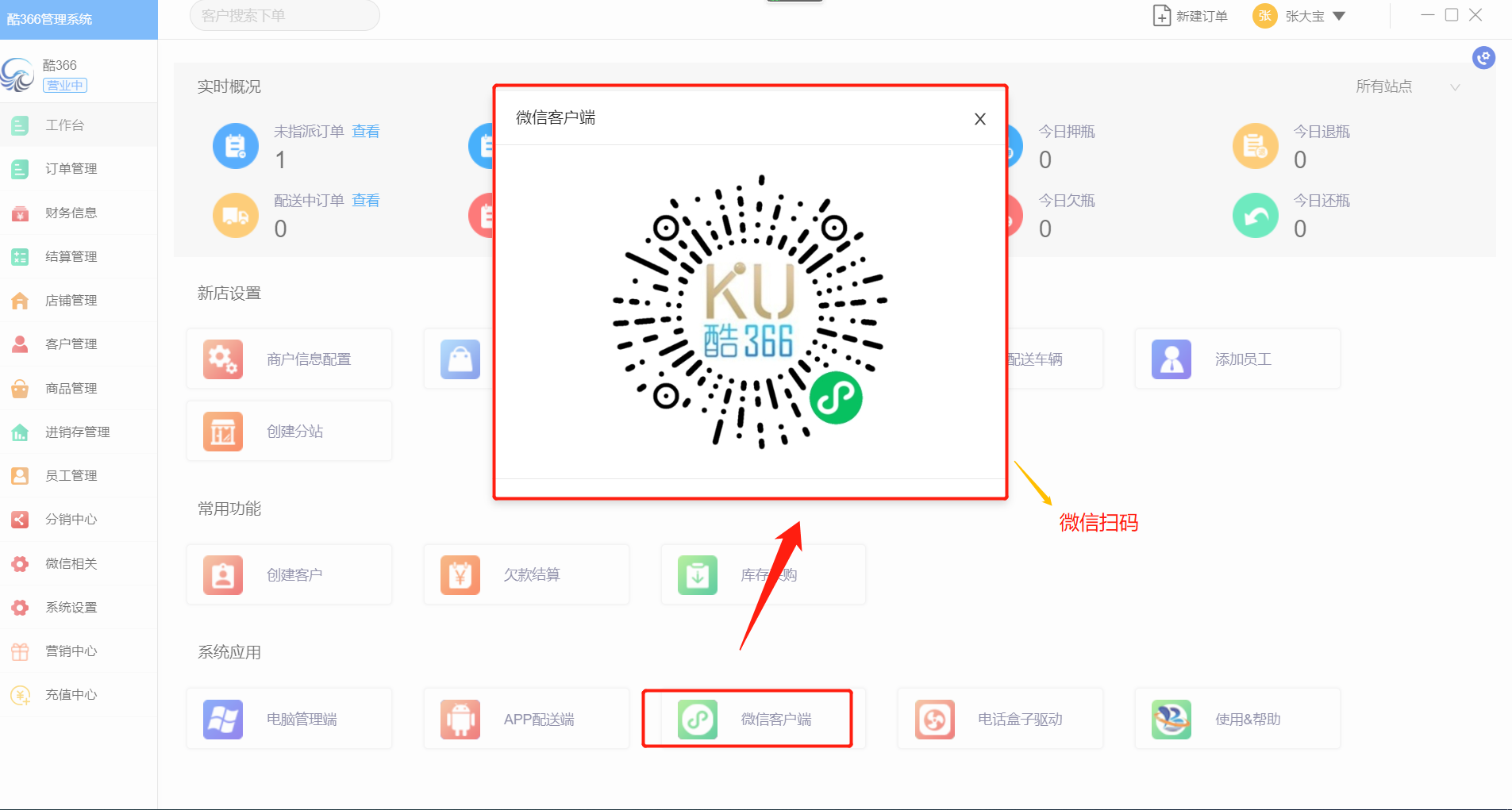 1、打开电脑管理端进入工作台 2、微信扫码后点击微信右上角适用浏览器下载...