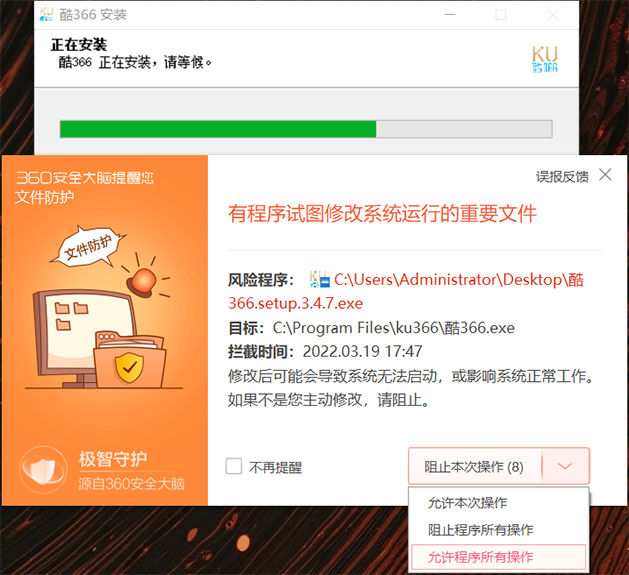 4、电脑有装360的,请选择“允许程序所有操作”